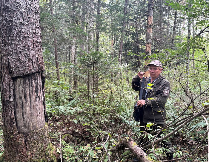 Давно канула в Лету традиция упаковки корней женьшеня в конверты из кедровой коры, но память о былых корневщиках сохранилась в виде таких лубодерин на столетних кедрах.
