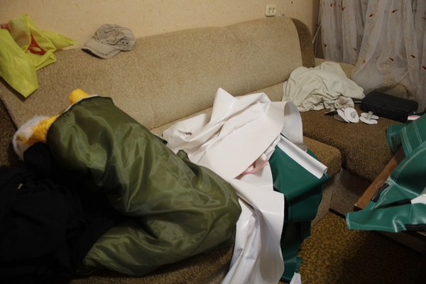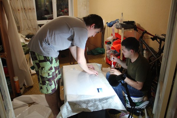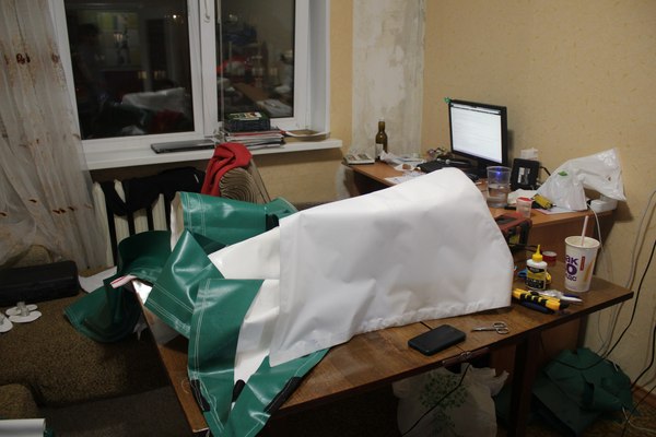 Когда все детали были вырезаны, подписаны и скручены в рулон, мы начали шить. На обычной, бытовой машине. Лили масло, тянули, ломали иглы, чинили машинку, рвали нитки... 2 месяца каждые выходные и иногда даже по вечерам... Это был мой личный кошмар. Мне снились швы, нитки, иголки... И все это каким-то диким калейдоскопом проносилось ночью у меня перед глазами. Фото самого процесса я так и не нашел, зато остались фотки бардака в квартире: