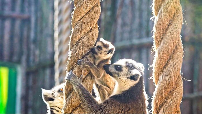 Размер кошачьих лемуров сопоставим с кошками. Это очень социальные животные, обычно группа составляет около 20-30 особей! Груминг - одна из форм взаимодействия в группе, помогает заводить друзей и укреплять близкое знакомство.