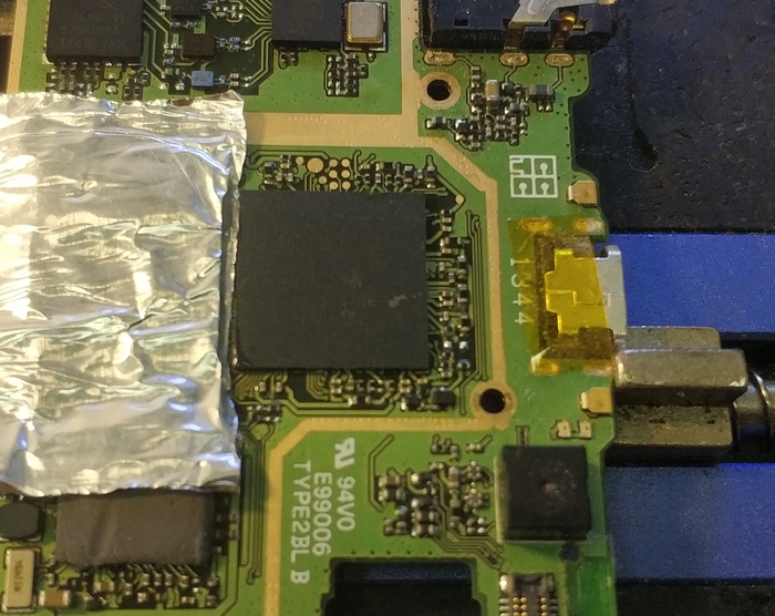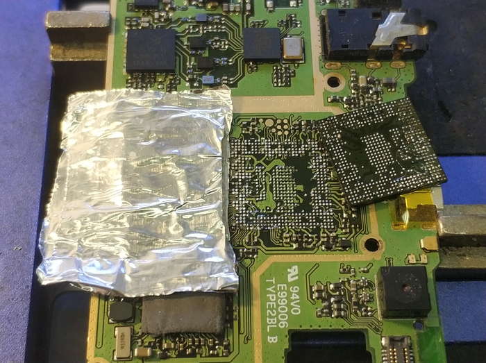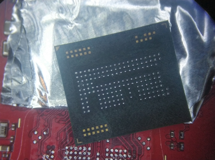 Поэтому закроем, стоящий рядом процессор, фольгой. И аккуратно греем микросхему флеш по всему периметру, постепенно поднимая температуру и поддевая чем-то за край. Когда шарики припоя под микросхемой расплавятся, то ее можно будет без труда снять. Главное не прилагать усилий, иначе с какой-то стороны оторвутся контакты.