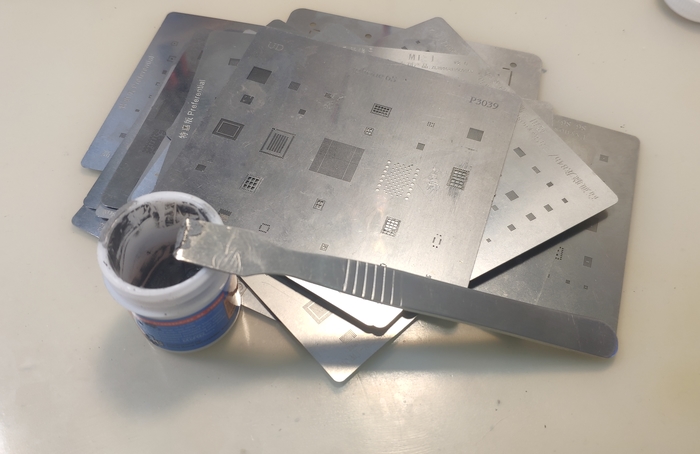 Дальше нам потребуется постоянно пополняемый набор трафаретов, в котором всегда можно найти нужный рисунок, самая обычная паяльная паста за 200рублей с али и такая же лопатка за 100.