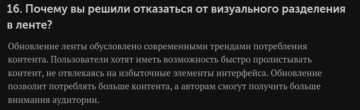 Сначала я думал, что у меня просто баг. Пропало разделение между постами в ленте. Выгладит ужасно, читать невозможно, ни в одной социальной сети такого нет. Хотел написать в поддержку, нашел следующую статью. В вопросе 16 оказывается, это все сделали специально. Раньше я хоть изредка заходил полистать, ведь остались еще активные группы. Сейчас выбираю альтернативу, потому что физически смотреть невозможно.