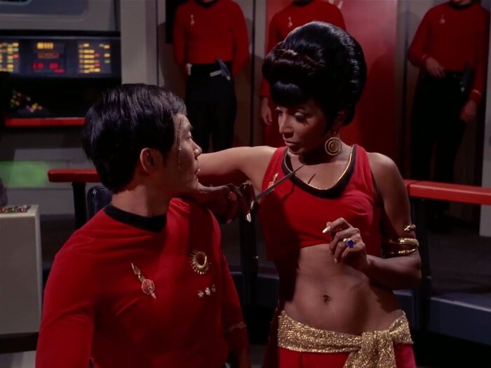 Главным послом прогресса в «Стартреке» была лейтенант Нийота Ухура (Нишелль Николс) — не просто женщина, а афроамериканка в ранге старшего офицера связи. До этого чернокожие актеры появлялись на телеэкране в основном в ролях прислуги. Фанатом Ухуры был Мартин Лютер Кинг, и когда он узнал, что Николс собирается уйти из сериала после первого сезона, то встретился с ней лично и уговорил остаться, ведь она служила наглядным примером для чернокожих девочек. Он оказался прав: в числе прочих Ухура вдохновила Вупи Голдберг (которая позже сама сыграла в «Следующем поколении») и первую афроамериканскую астронавтку Мэй Джеймисон.