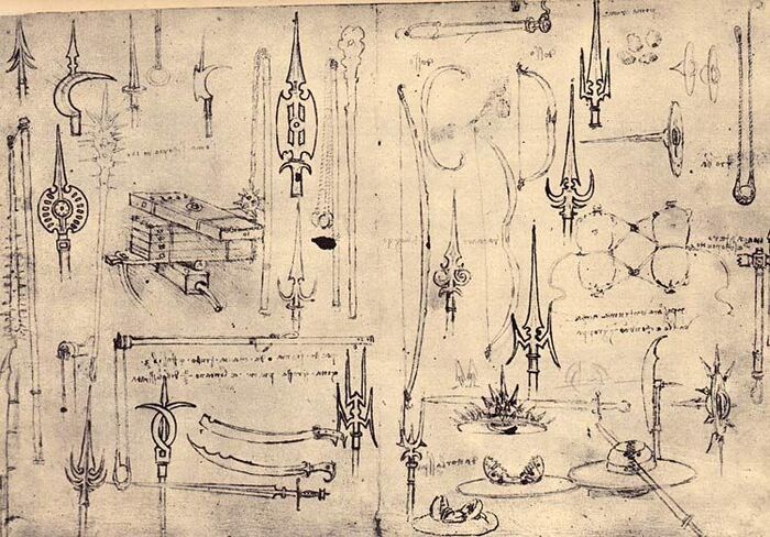 В 1482 году Леонардо уезжает из Флоренции в Милан. В те годы Милан был крупнейшим центром оружейного производства. Между городами – государствами на территории Италии постоянно вспыхивали междоусобные войны, поэтому мастера – оружейники и военные строители были чрезвычайно востребованы. Имея это в виду, Леонардо привез в Милан созданные им чертежи оригинального оружия и хитроумной военной техники.