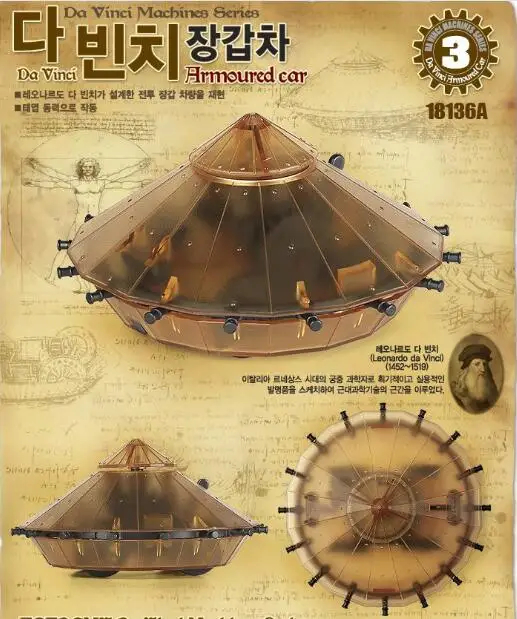 На рисунках Леонардо видно, что танк должен был быть сооружён из деревянных и металлических частей. Механизм, посредством которого осуществлялось движение, состоял из четырёх колёс, зубчатых шестерен и рукояток. Танк должен был перемещаться посредством мускульной силы экипажа. По периметру конструкции располагаются пушки. Наверху сооружена смотровая башня.