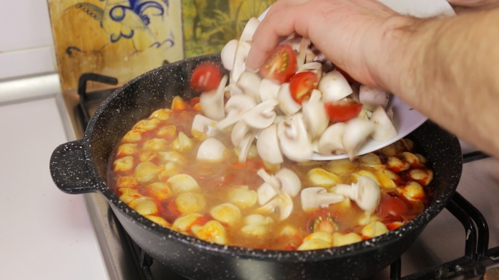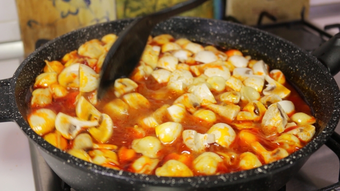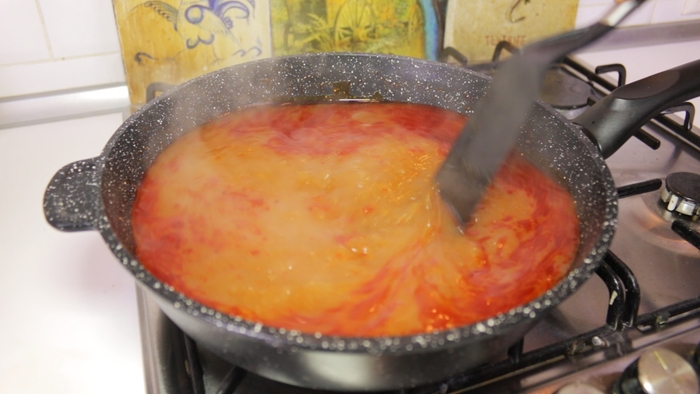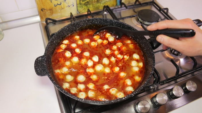 Дальше еще элементарнее. Берем сковородку, заливаем в нее воду, ставим на большой газ, кидаем туда ПОМЫТЫЙ лавровый лист и когда бурление воды достигнет апогея, идем за тефлоновой штучкой. Я, правда не знаю, как она называется. И аккуратно, все ссыпаем прям в кипяток, придерживая этой штучкой, похожей на большую ложку, что бы брызгов не было (я сначала с целофана в тарелку выкладываю. Сложно, но вареный целофан мне не нравится. )