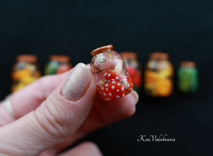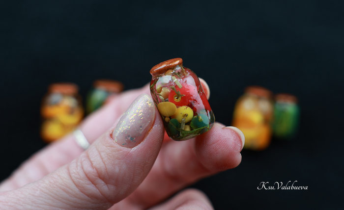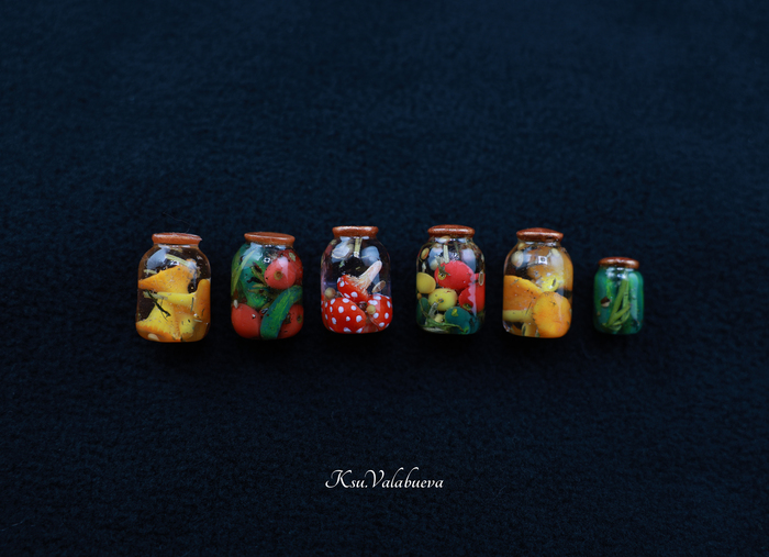 Грибочки, помидорки и огурчики слеплены из полимерной глины.