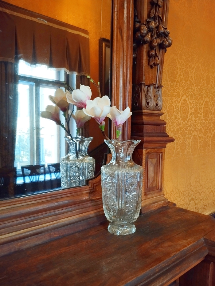 В преддверии 8 марта меня с моими цветами из холодного фарфора пригласили на мероприятие. Оно проходило в старинном особняке Петербурга. Цветы были расставлены по залу, на камине, в гостиной.
