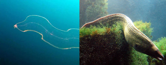 Лептоцефалы немного напоминают угрей, но у угрей не бывает брюшных плавников и длинных, игловидных зубов.
