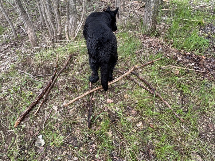 А это на траве лежат наши любимые палки для плавания. Хорошая палка должна быть не абы какой, а массивной, увесистой, длиной метр и чуть более, чтобы можно было правильно размахнувшись, забросить её подальше.