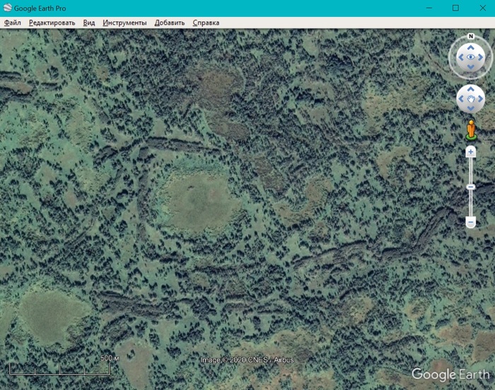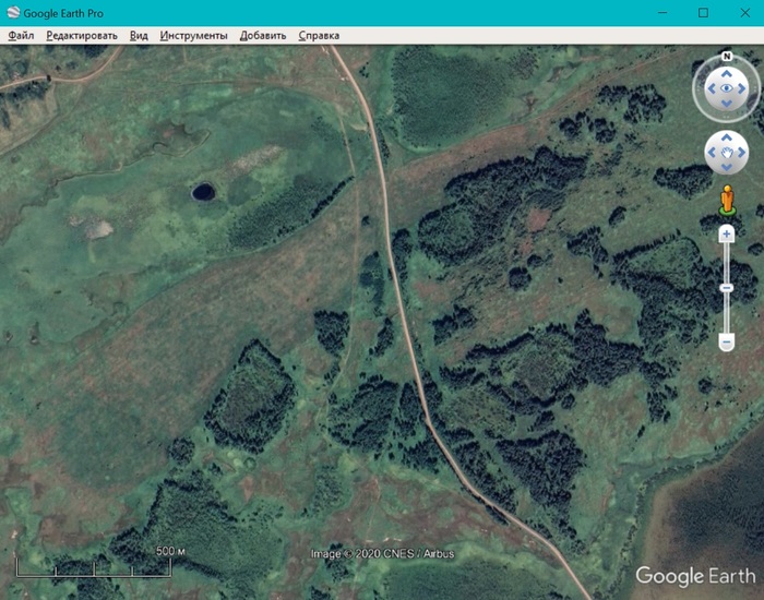 На общедоступных космоснимках за годы, предшествующие рубки, не видно ни признаков вываливания леса ураганом, ни обширного повреждения леса насекомыми-вредителями - так что в реальности, скорее всего, лес лечили просто от накопленного в нем запаса хозяйственно ценной хвойной древесины (и с этой задачей справились вполне успешно). Вот так этот лес выглядел до рубки на сентябрьском космоснимке 2014 года из системы Google Earth - границы сплошной санрубки 2016 года показаны желтой линией, внутри видны следы прошлой интенсивной выборочной рубки, и очаговое усыхание ели на отдельных участках. Шоссе в правой части снимка - это новая автомобильная дорога "Сортавала":