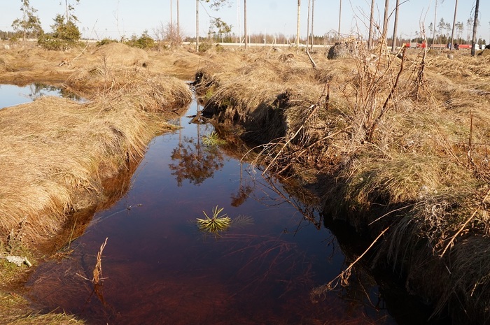 Пробная площадь 20. Координаты: 60°28'39,9" с.ш., 30°11'30,9" в.д. Количество жизнеспособных сеянцев из состава лесных культур: ели - 11, сосны - 26, нежизнеспособных: ели - 2, сосны - 3. Подроста естественного происхождения и самосева не отмечено. Общее количество жизнеспособных сеянцев хвойных соответствует 925 штукам на гектар, что выше минимального предела для культур, которые не считаются погибшими - но при таком количестве выживших сеянцев культуры требуют обязательного дополнения (п. 47 Правил лесовосстановления). Однако, на этом участке большинство формально еще жизнеспособных сеянцев на момент обследования находилось в воде или под водой, в залитых бороздах, что неизбежно будет способствовать дальнейшей гибели значительной их части.