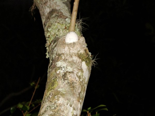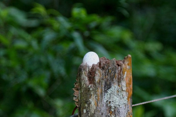Вот так, прямо на пеньке, птица и насиживает своё единственное яйцо.