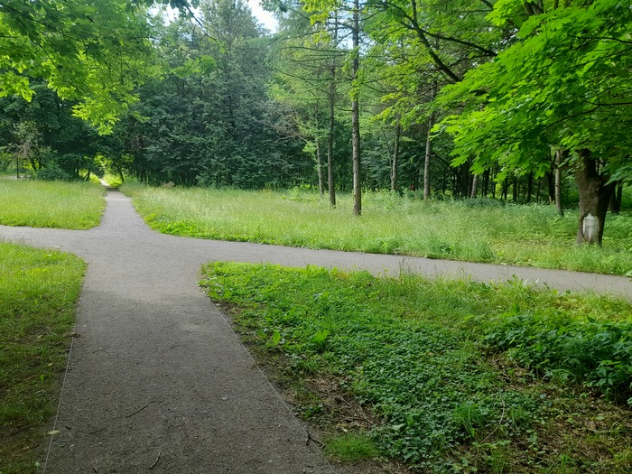 Это оказалась поляна с несколькими скамейками и вырезанной из пня совы. От нее отходило несколько троп, по которым катались мальчишки на велосипедах. Здесь, понятное дело, не заночуешь. Прошли по одной из малозаметных тропинок вглубь деревьев и нашли скрытую от посторонних глаз полянку. Здесь заночевать можно. Главное, чтобы ночью здесь не собирались всякие недобропорядочные граждане.