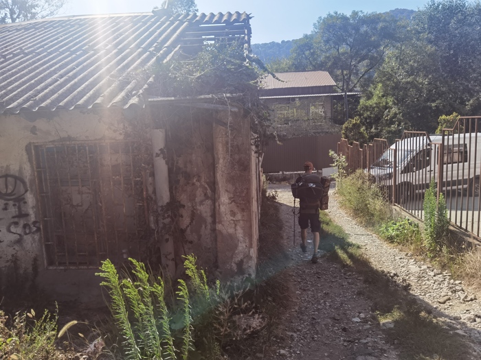 Спустились к полям, где присмотрели место под палатку на случай, если наш вариант снова будет сомнительным, затем вышли в сады. В одном месте нашли дикорастущие кусты ежевики и яблоневые деревья. Что одни, что другие были недоспелые, но немного, все же, удалось полакомиться.