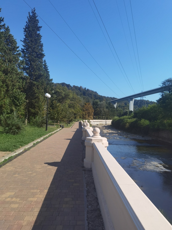 Когда шли вдоль красивой набережной, я то и дело просматривала в неглубокую реку, рассматривая рыб. И в один миг я увидела в реке змею. Она сначала в плыла, а потом нырнула, когда рядом проплыла рыба, но не успела и спряталась под камень. Олег меня дёргал, что надо быстрее, так что я не успела снять на видео ее, но было удивительно. Сейчас, после активных обсуждений в комментариях, я догадываюсь, что это, скорее всего, был водяной уж.