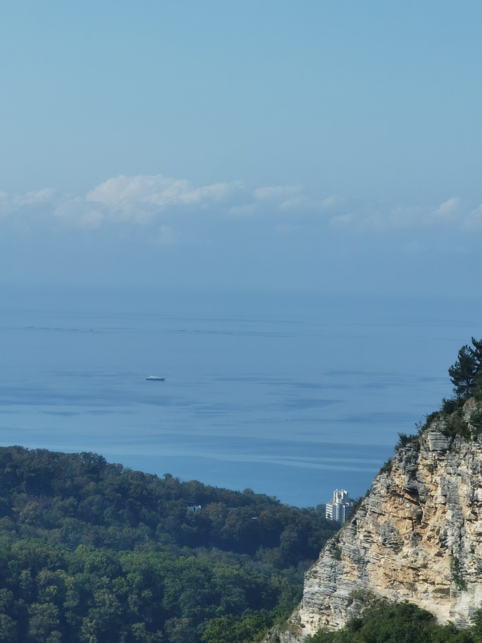 Поднявшись к первой видовке, увидели ущелье, немного ближайших гор, голые отвесные белые скалы