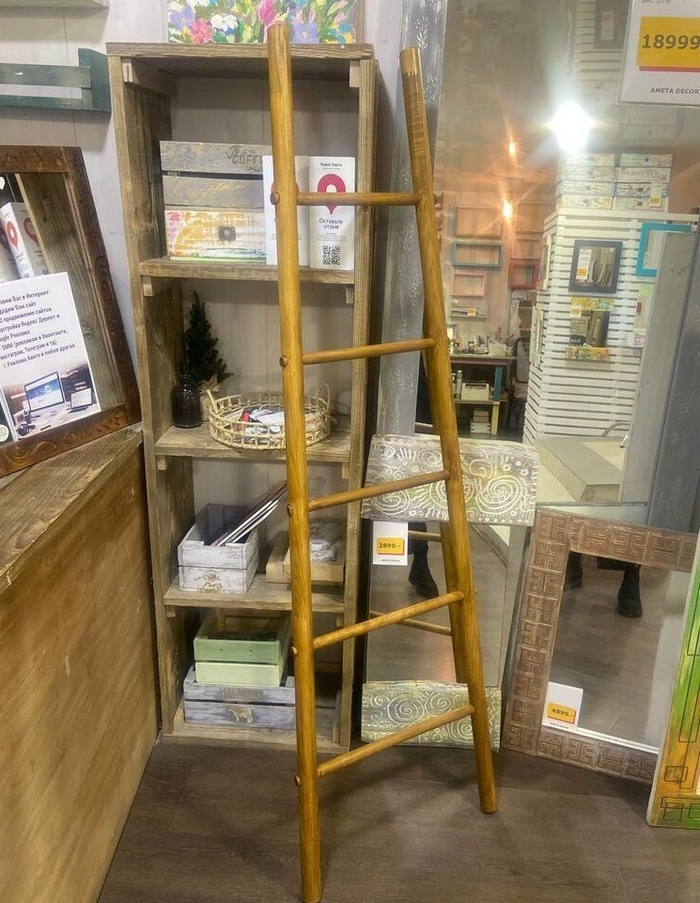 В нашем шоуруме в Звенигороде одна вешалка-лестница стоит рядом со стеллажом — и работает как экспозиция для текстиля. Клиенты часто говорят: «А я думала, это просто декор». Нет, это функциональный декор.