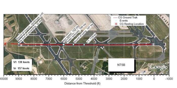 Расследование установило, что на развитие аварии повлияло сразу несколько факторов. В третий двигатель попала птица, что вызвало его остановку и громкий хлопок, сильно испугавший экипаж и повлиявший на их восприятие. Самолёт начал разбег не с начала полосы, а с пересечения B1, что сократило длину разбега примерно на 300 метров. При этом расчёты выполнялись для полной длины полосы, создавая у экипажа ложное чувство безопасности.