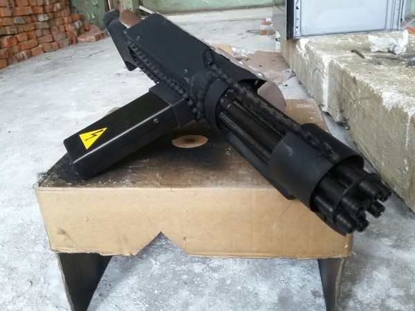 Делал без чертежей и наугад. Блок стволов вращается. Привод сделан из мотора от сломанного шуруповерта. Аккумуляторы в магазине разместил. Выключатель под спусковым крючком от сломанной болгарки.