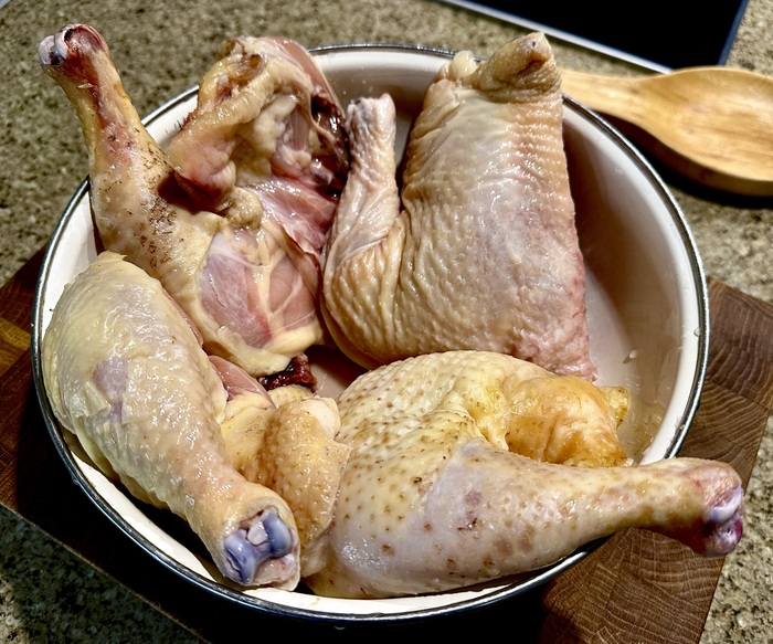 Курица. Вернее, вот такие бедра с голенью лучше взять. Чтобы потом было проще и удобнее делить на порции я сразу разделал на бедра и голени (булдыжки…).