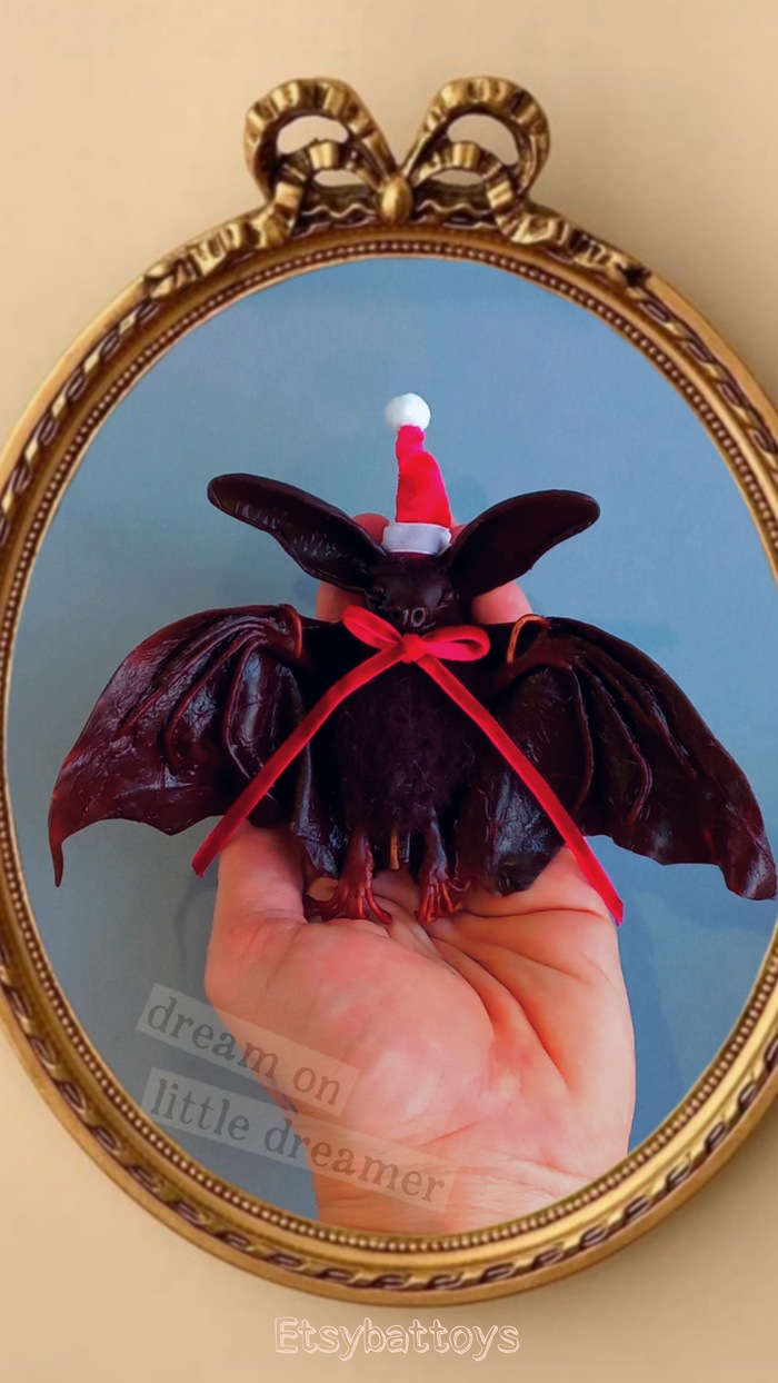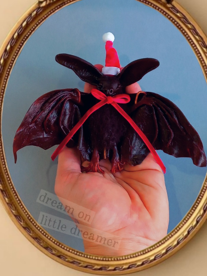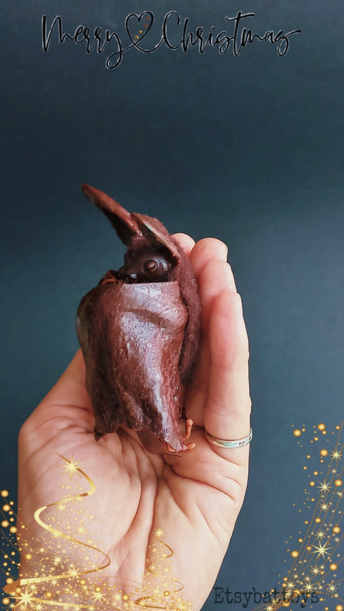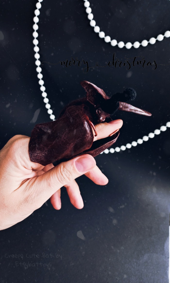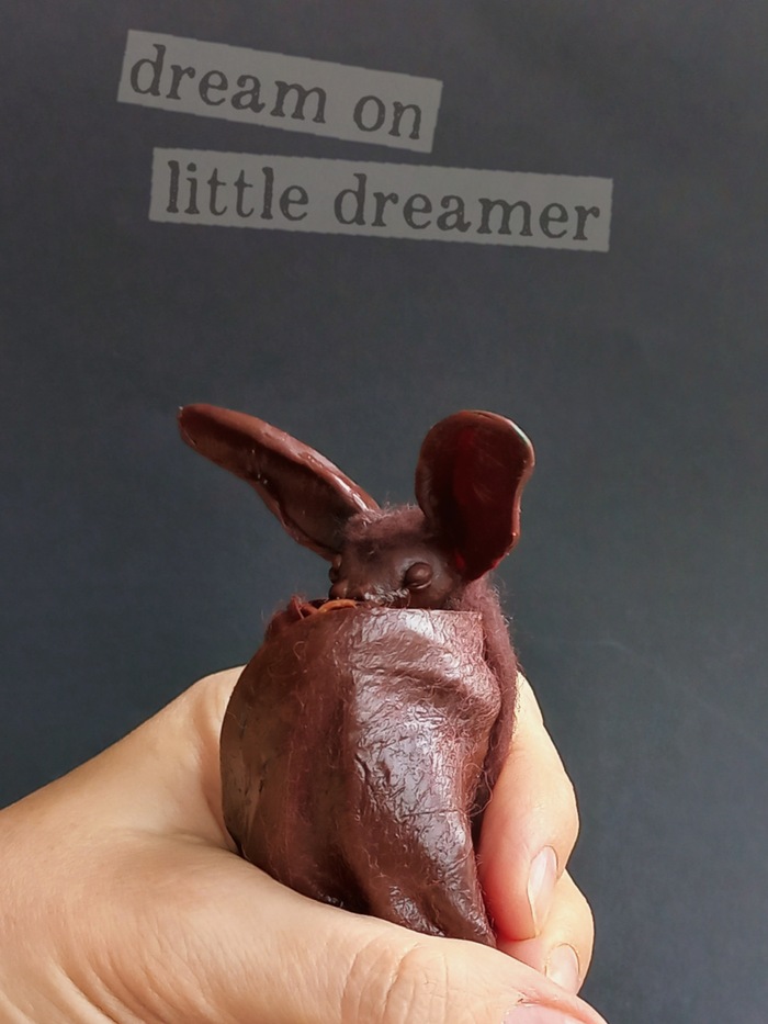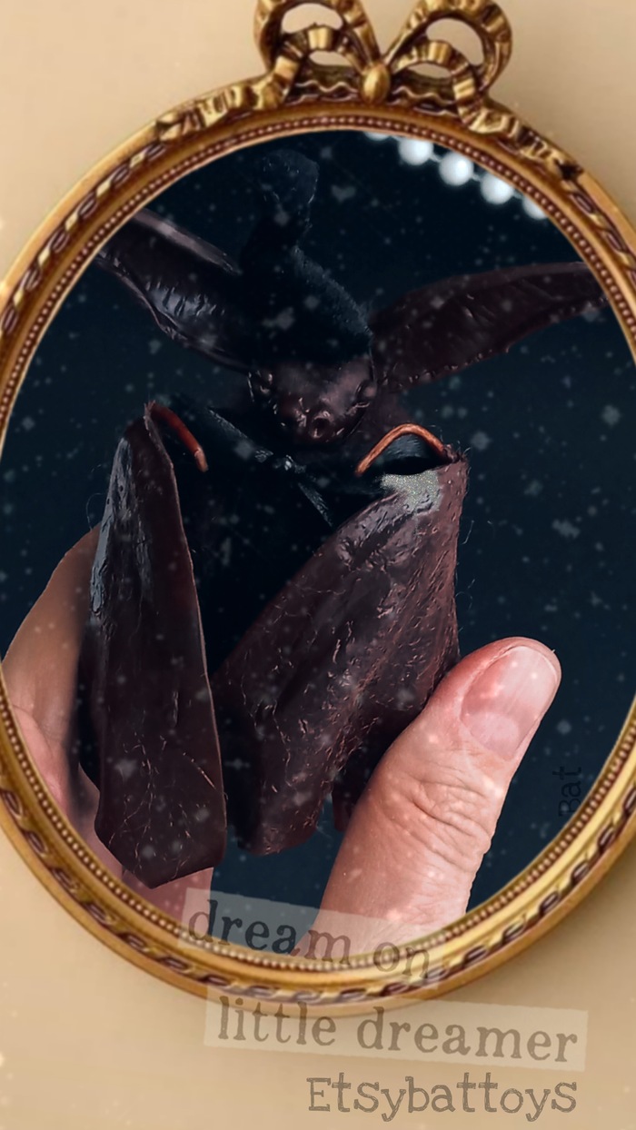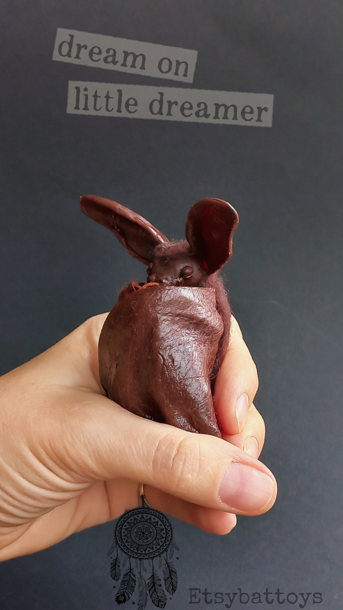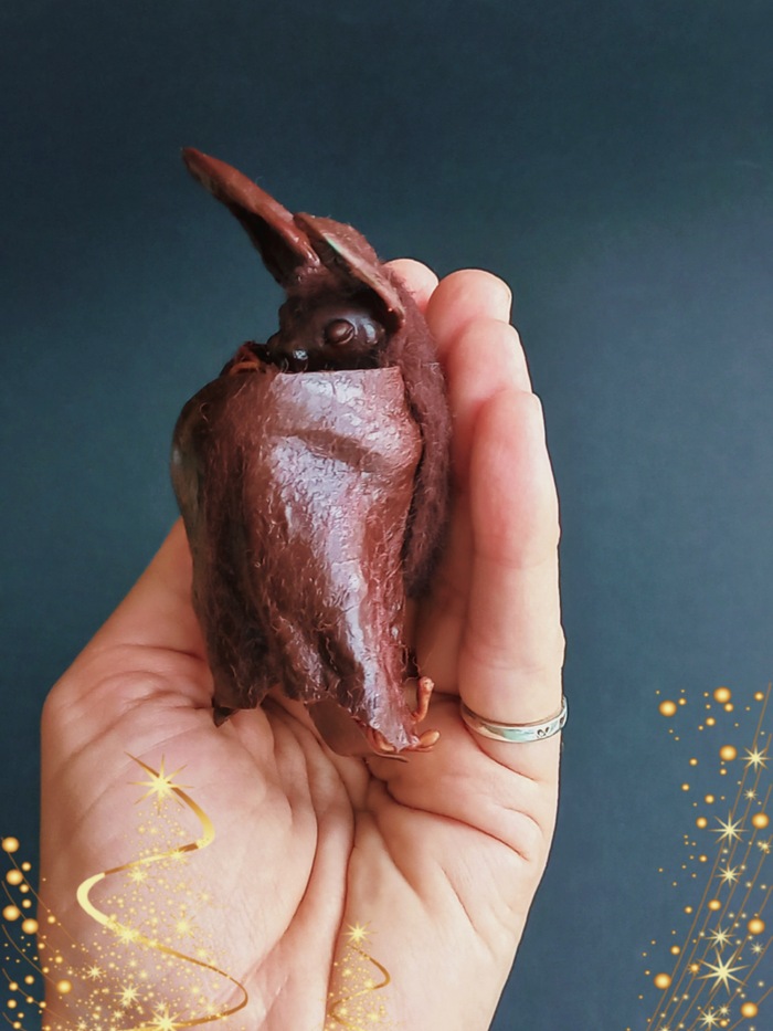 Дошла очередь до маленькой мышки. Это ушан. Он выгядит как живой за счет текстуры под кожу. На крыльях видны прожилки. Крылья гнутся. Каждый коготь гнется. Тельце из австралийской шерсти. Может быть отличным компаньеном для готической куклы. Ладошечный размер, очень удобно можно согнуть в любую позу.