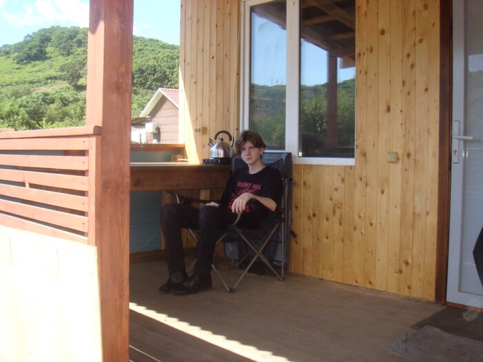 Отдыхающий Савелий и один из домиков, в которых мы жили