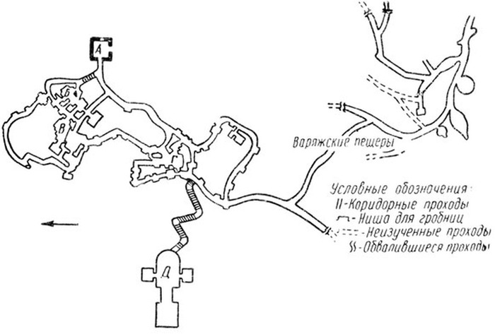 План Ближних пещер. А - церковь св. Антония; Б - церковь св. Варлаама; В - Введенская церковь
