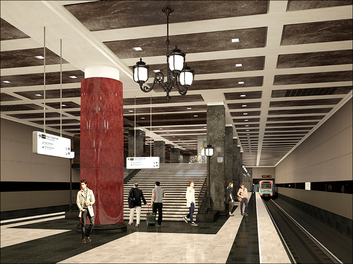 Утверждённый в 2015 году проект станции, согласно которому она и начала возводиться. Согласно ему, оформление станции стилизовано под интерьеры дворца XVIII-XIX века: