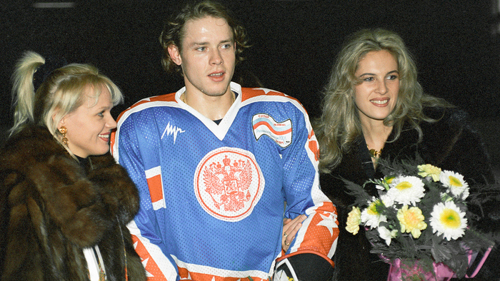 Российский хоккеист, легионер, выступающий в Национальной хоккейной лиге США, Павел Буре с поклонницами, 1995 год