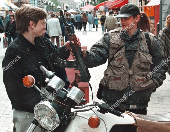 Уличный фотограф предлагает молодому человеку автомат, чтобы сфотографироваться с ним на Арбате в центре Москвы. 1997 год.