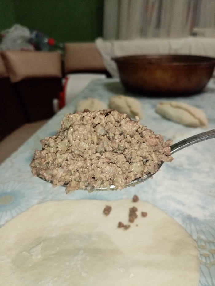 Вот прямо столько начинки я кладу. Чтоб не рассыпался, приминаю ложкой. Лепится тесто просто отлично.