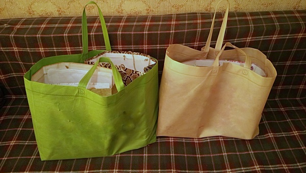 В коробке везти будет неудобно: слишком большая. Переложила всё-всё в пакеты. Вышло так.
