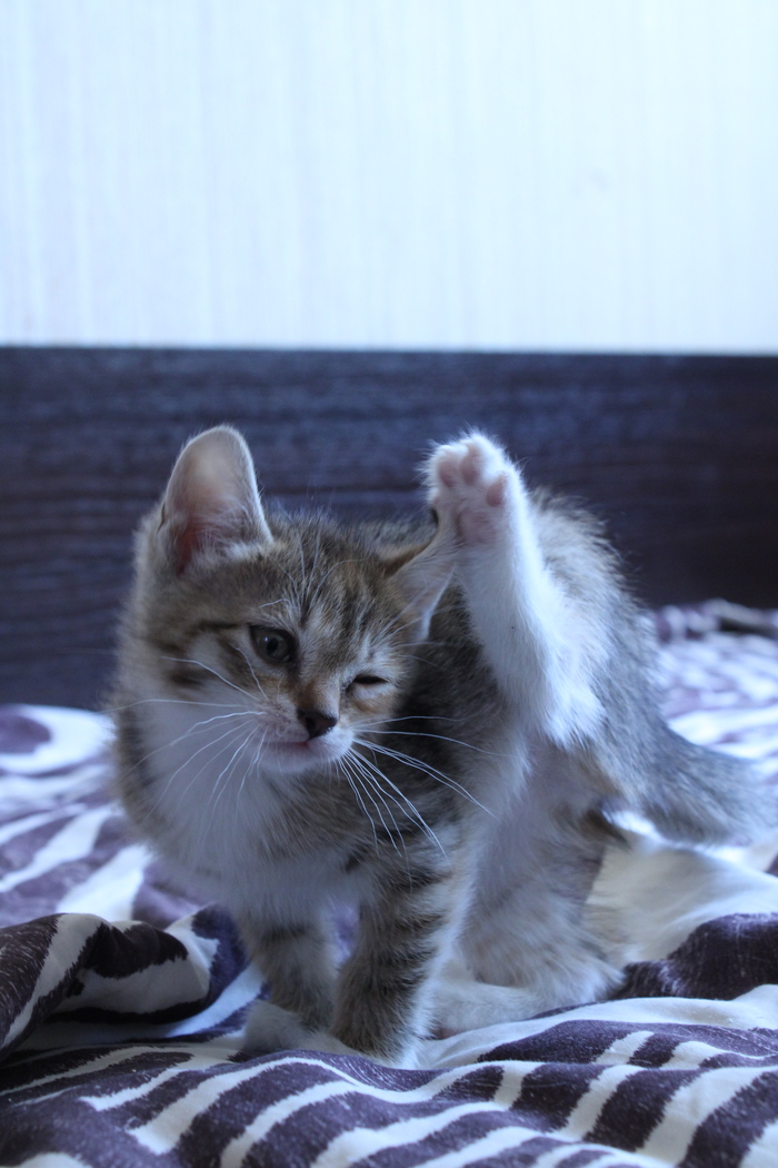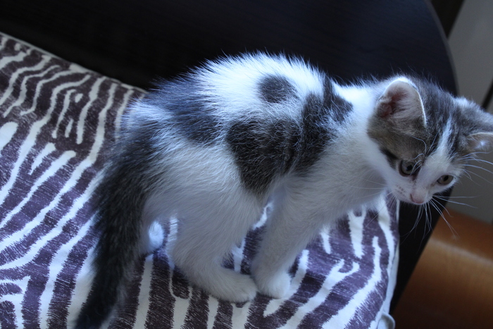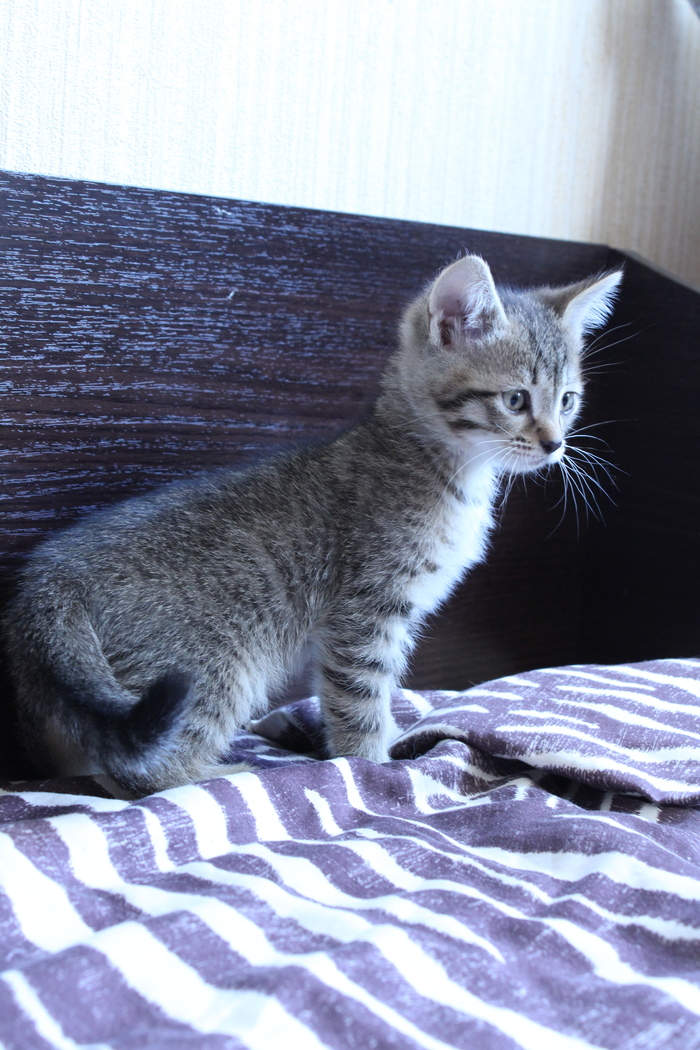 Котёнок-девочка. Милейшие глазки этой малютки растопят сердце любому. Назвали ее пятнышком. Быстрее всех научилась прыгать и преодолевать трудности.