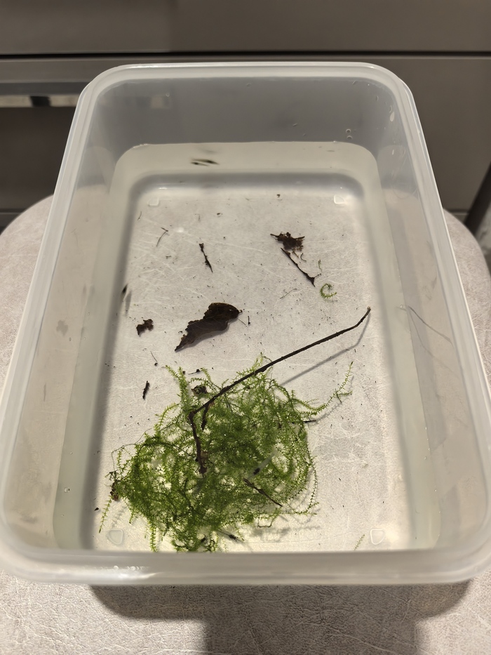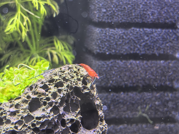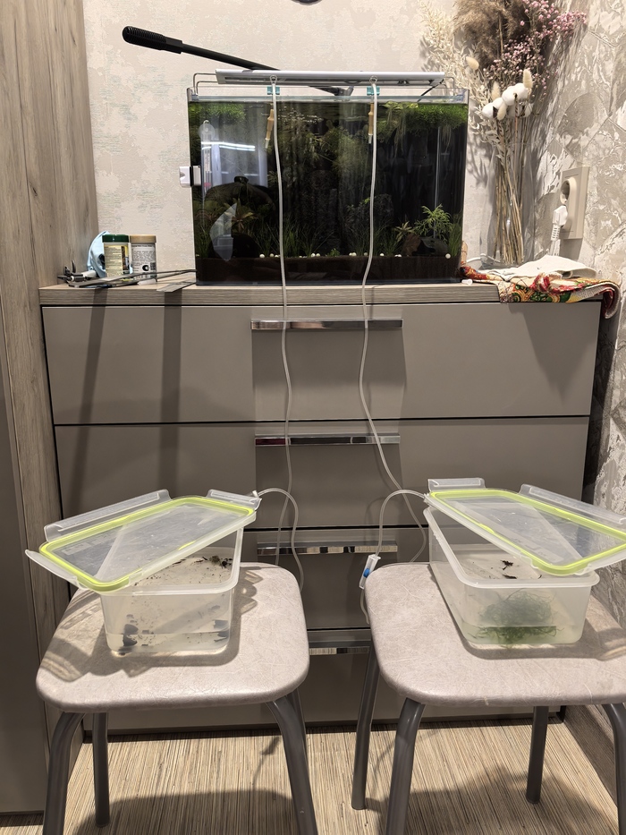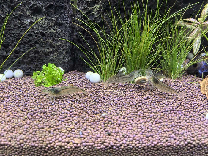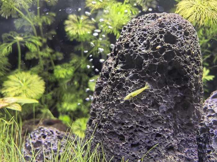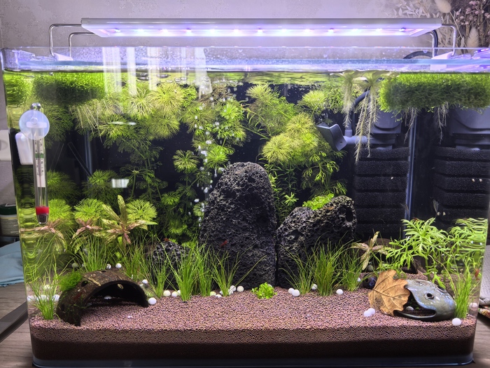 Всем привет! Прошло уже 6 недель с момента запуска моего первого креветочника. В аквариуме произошел ряд изменений. При плановой чистке аквариума и подмене воды, я заметил, что во мхах, которые мне так нравились и к слову, успели очень сильно разрастись, копится просто невероятное количество грязи и при любом шевелении этого мха поднимается страшная муть. Мхи было решено убрать и заменить на элеохарис мини, результат ниже на фото. С правого камня мох так же было решено убрать и заменить на Микрантенум Монте-Карло, котоый достался бонусом к элеохарису, посмотрим, что получится, по центру он же, но воткнут в грунт. К камню примотал капроновой нитью, жду.