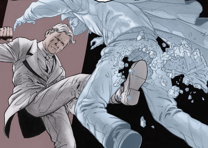 “Какой странный мир...и он станет лишь более странным”. Дверь квартиры, в которую Элайджа собирается проникнуть, заперта, но его это не смущает. “Я и не думал, что будет легко, но одной дверью меня не остановить”. Заморозив и уничтожив дверь, Элайджа заходит в богатую и довольно мрачную квартиру и слышит голос. “Мистер Сноу, я полагаю? Заходите, прошу. Думаю, вы знаете, как меня зовут. – Шерлок Холмс, не так ли? – Ох, ваш американский акцент отвратителен. Над этим придётся поработать. Всё же, полагаю, вы нашли замок барона. Интересно, как. – Тот невидимый чел, которого Вы отправили в Штаты за чертежами Парового Человека. Чертежи были у меня. Через Невидимого я вышел на вас. – Обошли Джона Гриффина? Я впечатлён. – Не столько обошёл, сколько подверг пыткам. Вы, барон со своим чудовищем, Гриффин и другие...я знаю, чем вы занимались в прошлом столетии. Но на дворе новый век, новые правила. Пусть я и уважаю вас, и восхищаюсь вами, у меня другой взгляд на мир. Ваш Заговор пора остановить”. И тут из-за спинки кресла Холмса выходит натуральный вампир. Практически 1 в 1 Бела Лугоши в роли Дракулы. Элайджа впечатлён. “Опа. Знаешь, даже странно. Я спокойно воспринял существование невидимых людей и безумных учёных с их оживающими творениями, а в тебя не верил”.