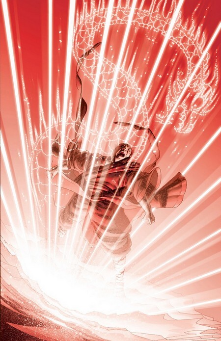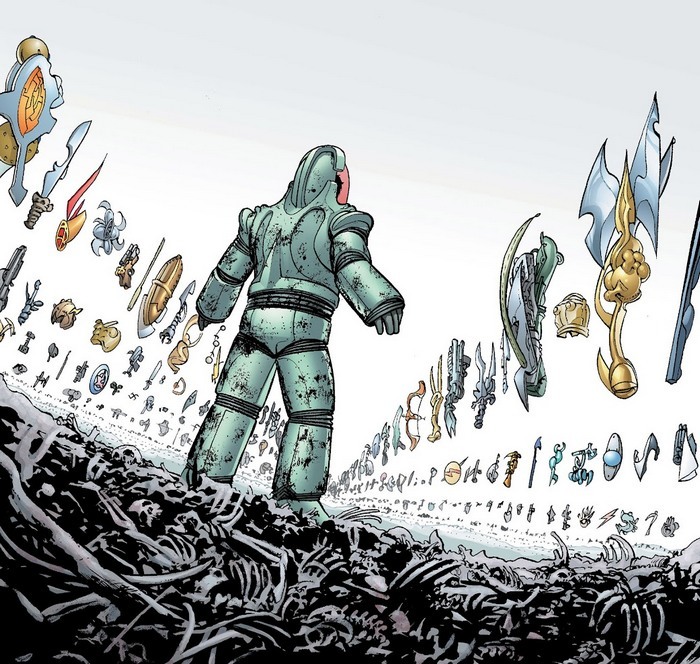 Продолжаем, разумеется, в комиксе Planetary #14. Время действия – 1995 год. Прикованный к инвалидному креслу учёный изучает кривую трость и приходит к выводу, что это не просто трость – её сердцевина сделана из высоких технологий и несёт отпечатки радиации Кровотока. Удар тростью об пол превращает её в высокотехнологичный молот! Учёный объясняет: трость и молот связаны “квантовой нитью” и при правильном применении кинетической энергии меняются местами через Кровоток. А вообще это толстая отсылка к Тору (в старых комиксах его молот превращался в трость до востребования). Это одинг из артефактов Четвёрки. Всё это учёный излагает Элайдже Сноу. По запросу Элайджи учёный прикладывает к молоту достаточно силы для расширения эффекта переноса и открытия портала. Элайджа проходит сквозь портал, надев защитную силовую броню, и видит бесконечное пустое пространство, в котором висят десятки щитов, бластеров, кистеней, секир, шлемов, перчаток, луков и прочей экипировки, а пол усеян толстым слоем костей. И понимает, что Четвёрка уничтожила целую цивилизацию, просто чтобы превратить один мир в место для хранения оружия.