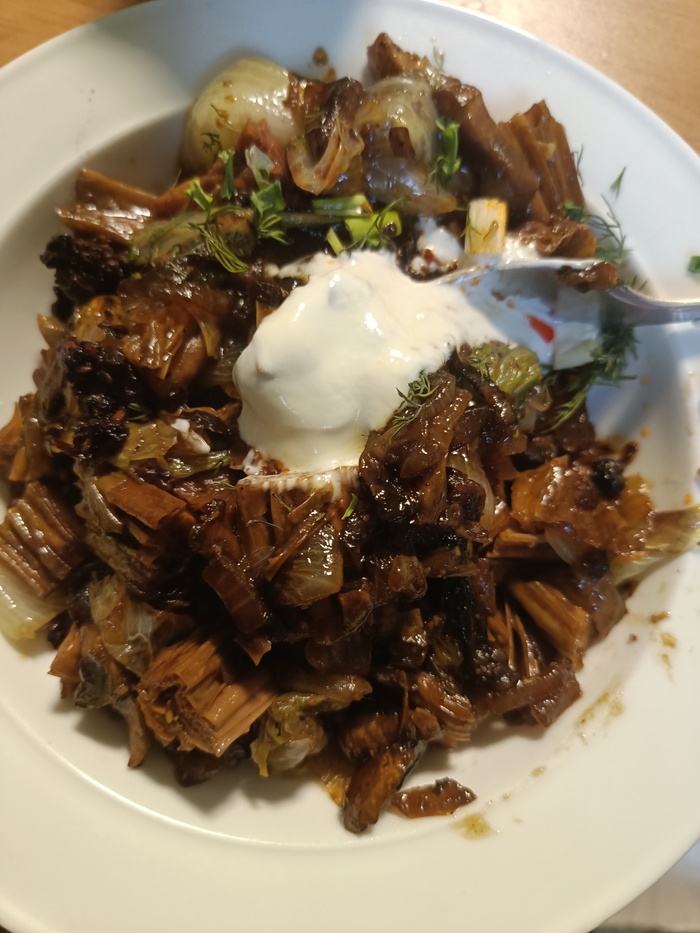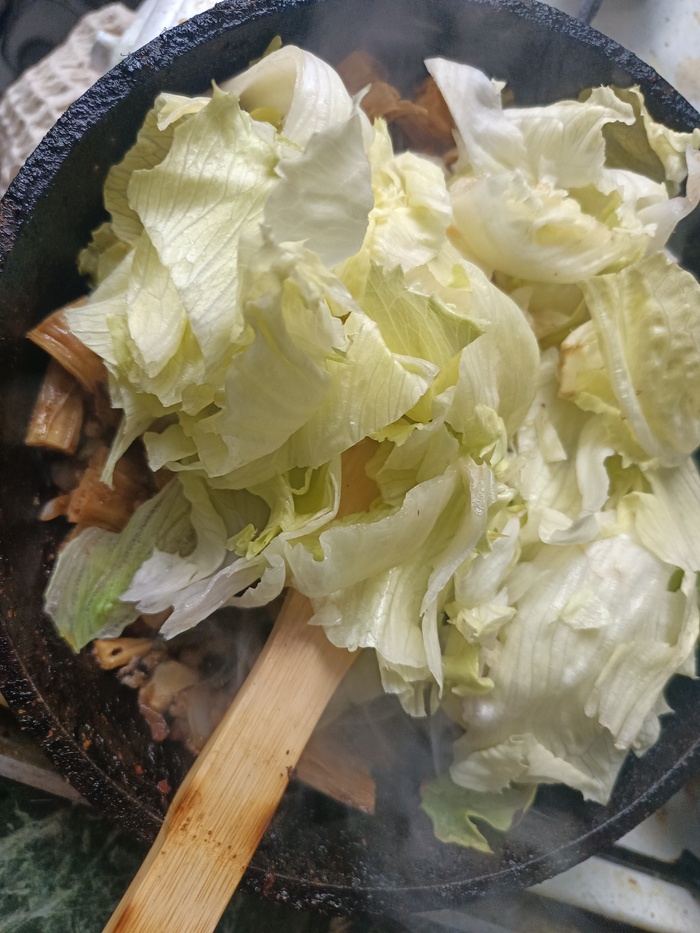 режу грибы и лук, кидаю на раскалённую с маслом сковородку. Режу спаржу, тоже кидаю в сковородку. Режу айсберг и тоже туда. Добавляю 10г сахара, соевый соус и приправы. Жду, пока вся жидкость не выкипит и вырубаю. В конце кинула остатки зелени, что были дома. Уже жду в комментариях, что напишут хрючево. Но зато вкусное и без заморочек.