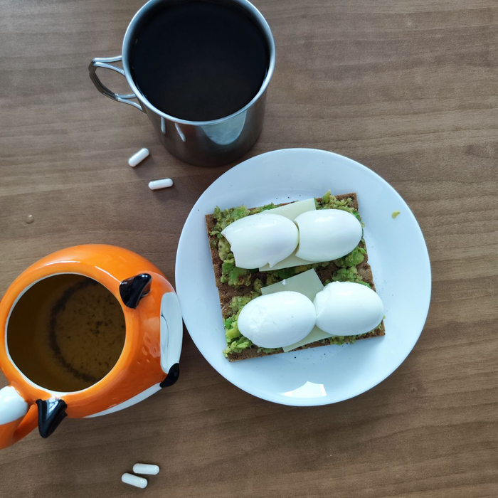 Завтрак был потрясающий — хлебцы с авокадо, тонкий кусочек твёрдого сыра и яйцо. Простое сочетание, но очень вкусное!