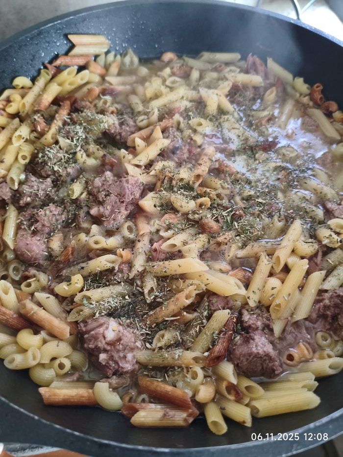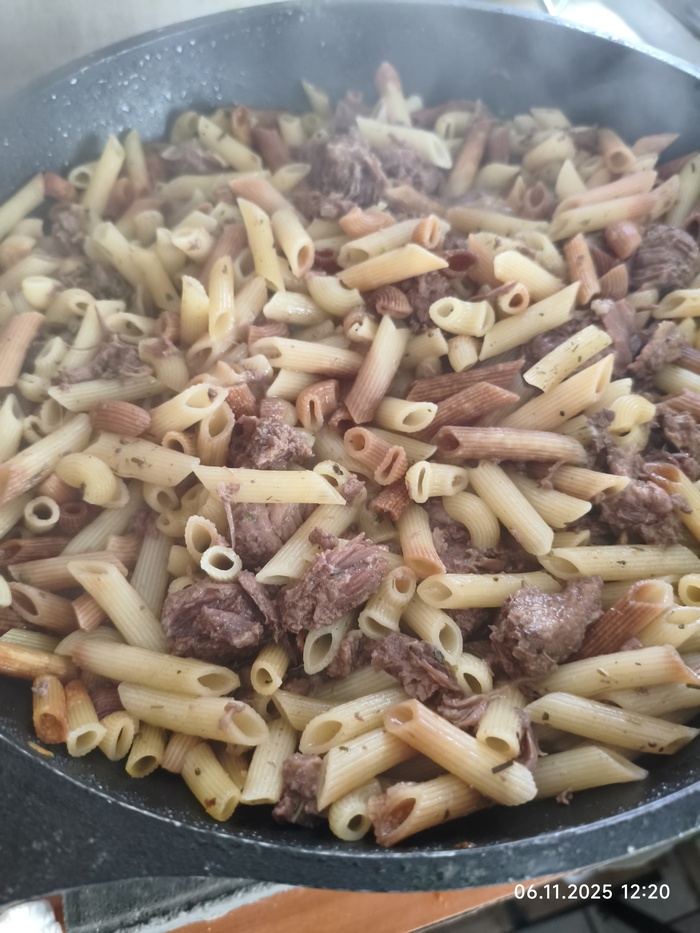 Сначала обжариваю макароны на раскалённой сковороде, потом когда поджарятся, то заливаю кипятком, осторожно, получается пыдышщщщ.