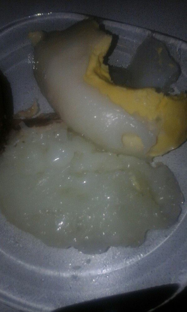 Выглядит жутко, но на вкус почти как обычное куриное яйцо, только белок больше желе напоминает. Желток более нежный чем куриный.