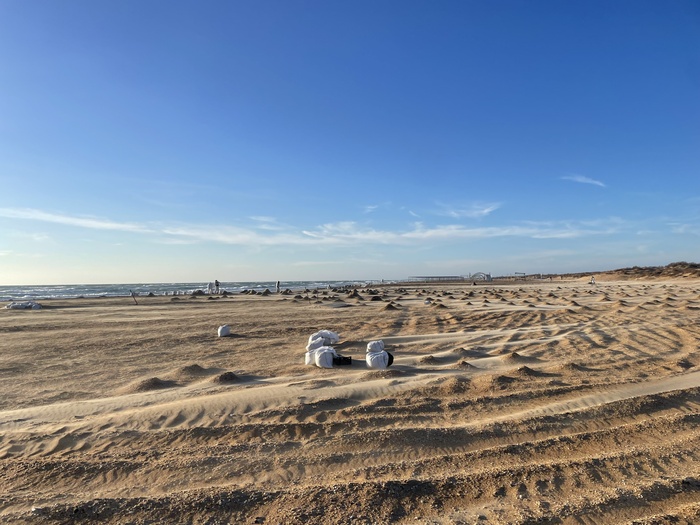 Суть в следующем, крупные куски мазута сверху песка в данном месте, были убраны ранее, как я понял, остались мелкие кусочки, размерам, примерно, 1х1 см, которые плохо видно и находятся они в верхнем слое песка, их нужно аккуратно сгребать в кучки, срезая тооооооненький слой и собирать в мешки. На фото видно участок, расчищенный, я был так рад, что удалось достаточно быстро расчистить кусочек пляжа, но, как оказалось, работы не видно ни конца ни края…. Если копать глубоко, то вероятно ниже еще слой с мазутом…