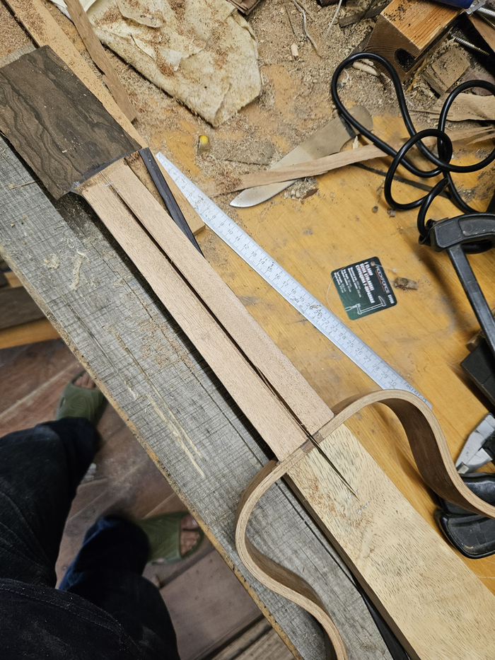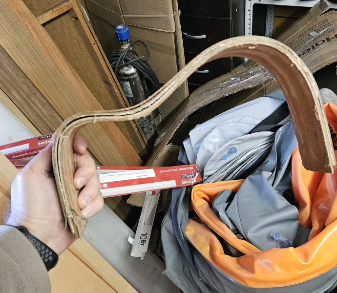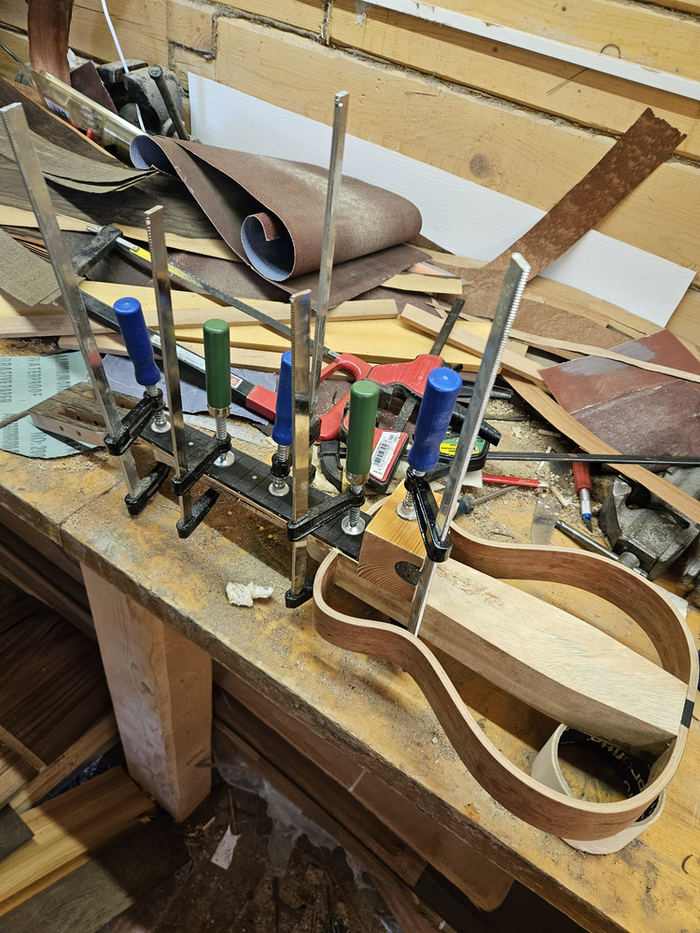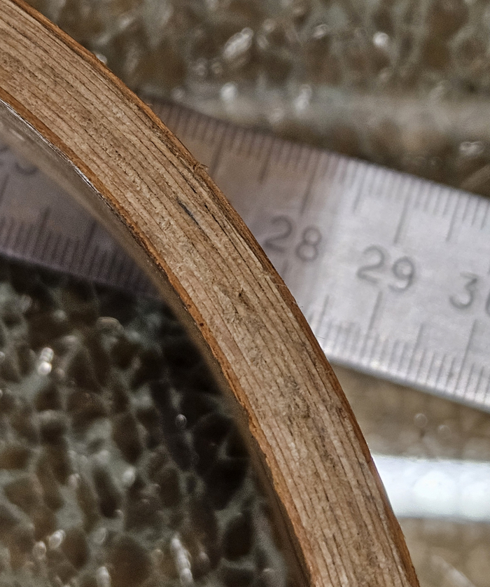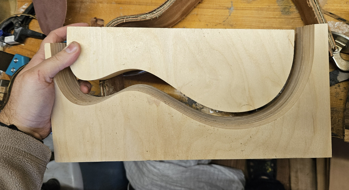 И приступил к склейке. Сначала попробовал набрать из семи слоев толстого и тонкого шпона (сапеле, дуб, мореный дуб). Но шпон 1,5 мм на сухую ломался при изгибе. После размачивания согнулся хорошо, но Titebond не склеил мокрую древесину.