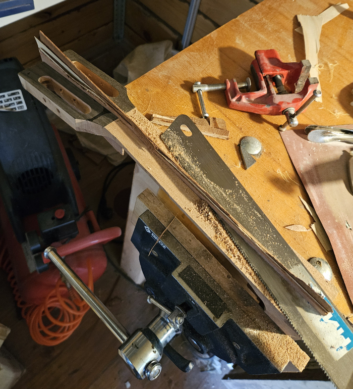 Поэтому распилил заготовку вдоль, и склеил с бутербродом из пяти слоев шпона