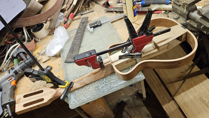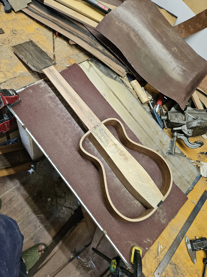Для укрепления грифа вставил карбоновую пластину по всей длине, и заодно на головку грифа наклеил эбеновый шпон. У гитар часто в гриф ставят регулируемый анкер. Но на укулеле натяжение струн меньше, и это, скорее, для самоуспокоения и более крепкого соединения грифа и корпуса.