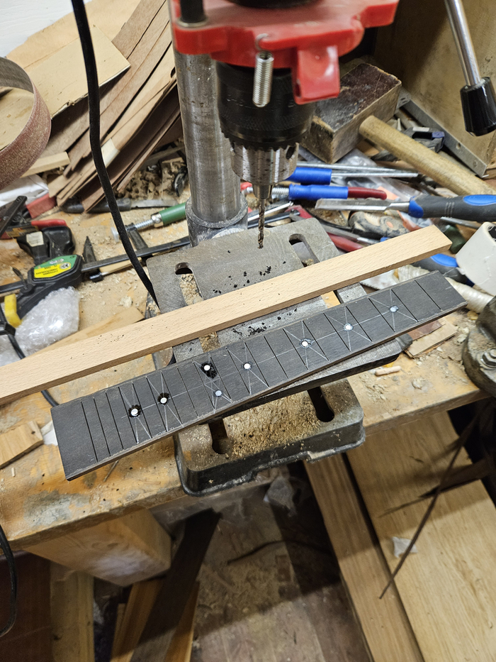 Накладку грифа использовал готовую, но ее тоже пришлось нарастить несколькими слоями шпона, чтобы гриф был шире. Поставил ладовые маркеры из перламутра