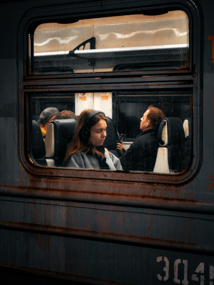 Ловите зарисовки из пригородного поезда. Вот люди, которые куда-то едут с утра. И те же люди, которые возвращаются вечером. Усталые, отрешённые, каждый в своём мире.