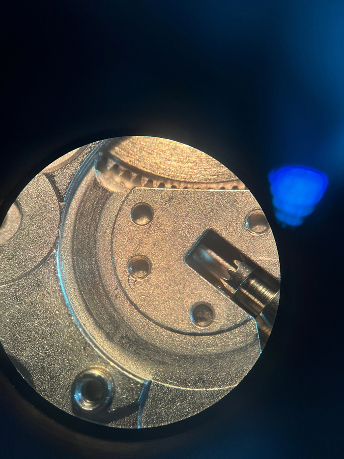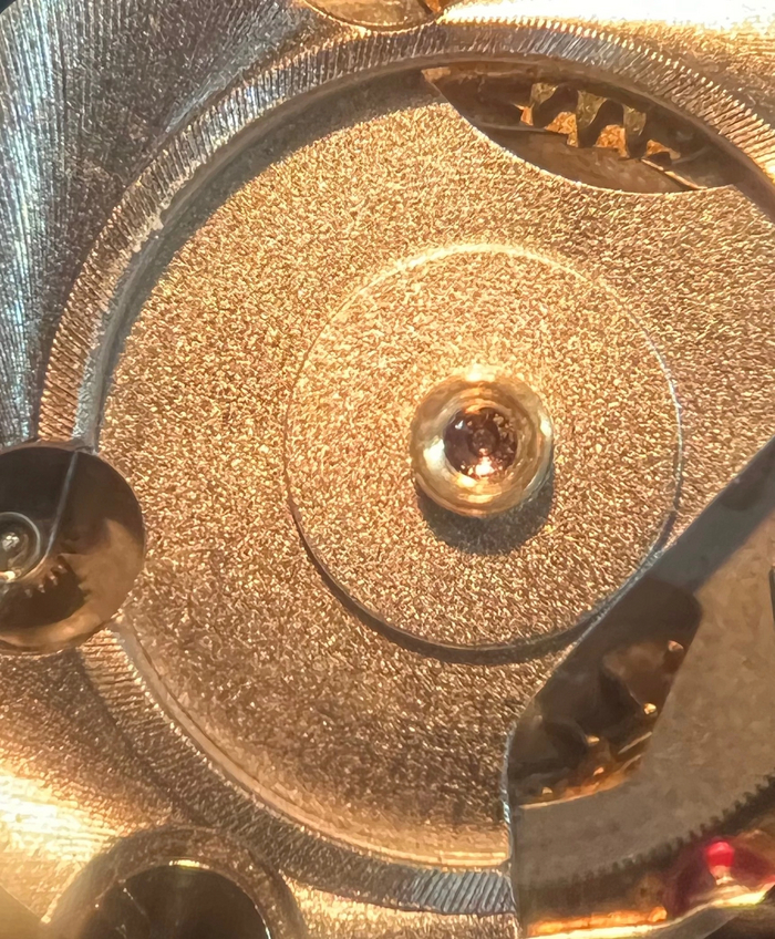 Следы от предыдущего мастера + потёртости на колесе барабана и повреждения на боковой грани моста хронографа