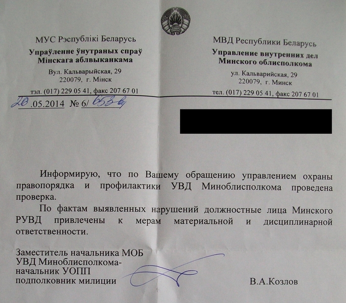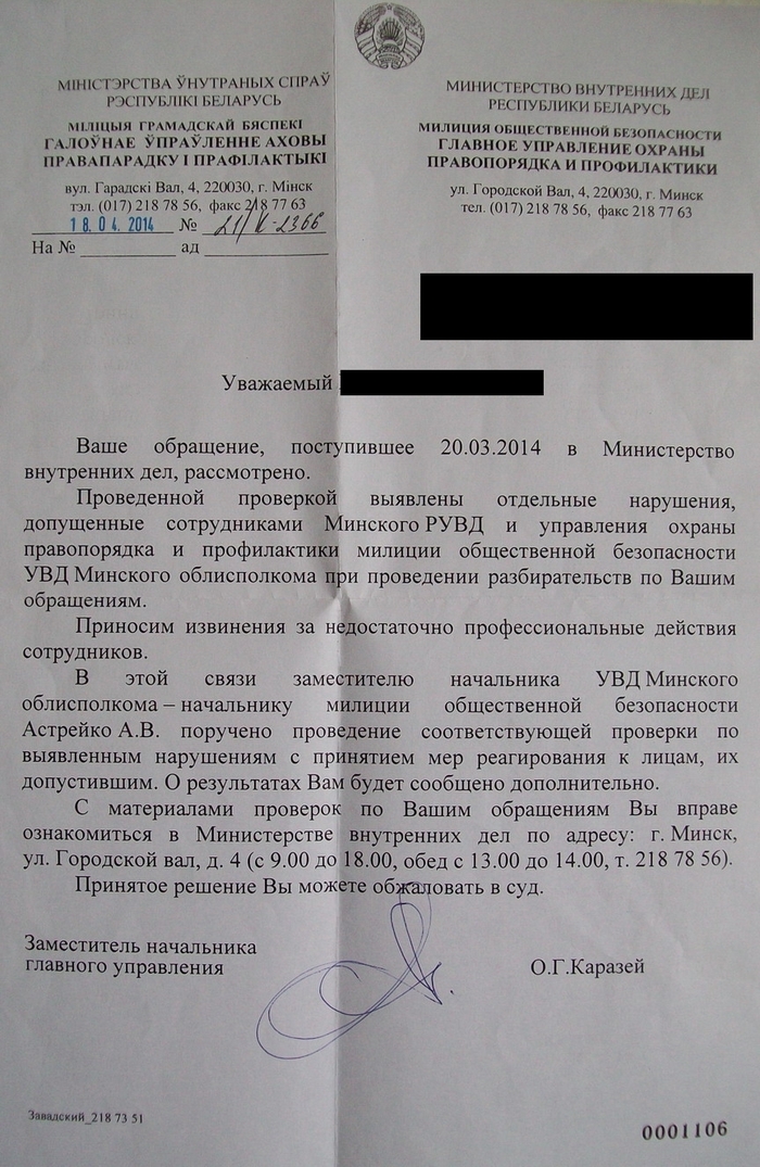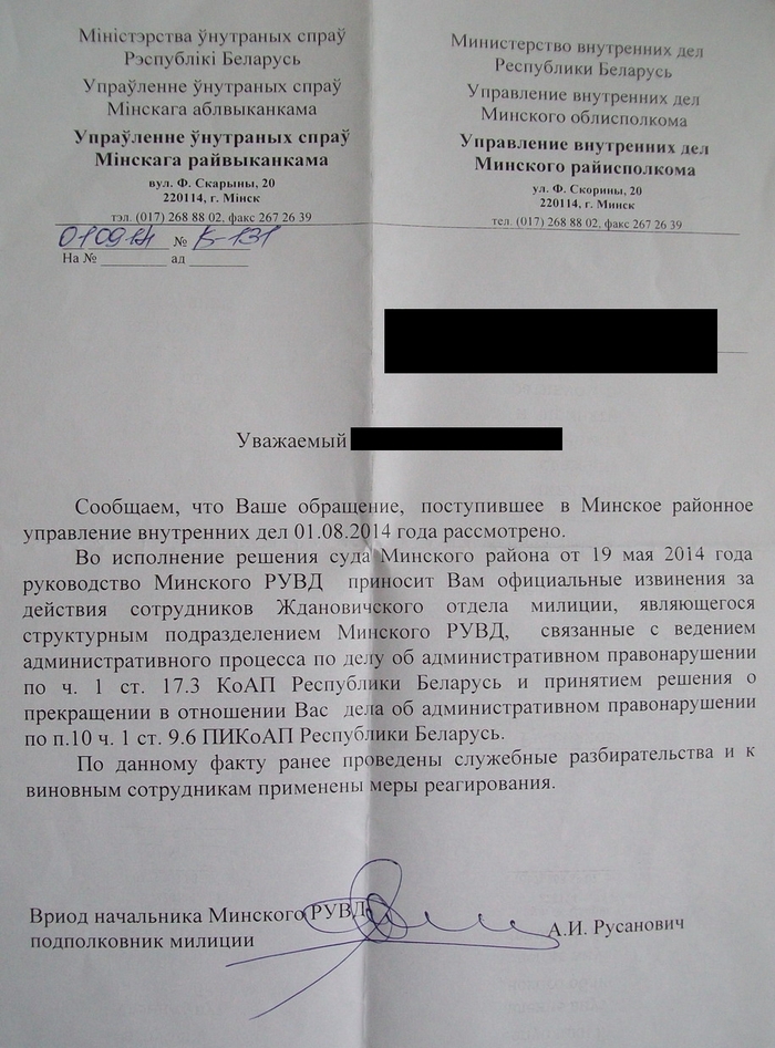 Только повторное обращение в Министерство внутренних дел Республики Беларусь, принесло свои плоды. Официальные извинения за действия сотрудников Ждановичского отдела милиции, являющегося структурным подразделением Минского РУВД, связанные с ведением административного процесса были принесены Управлением внутренних дел Минского райисполкома в сентябре 2014 года. Спустя более чем год со дня совершения незаконных действий. В итоге передо мной письменно извинились даже 2 раза.