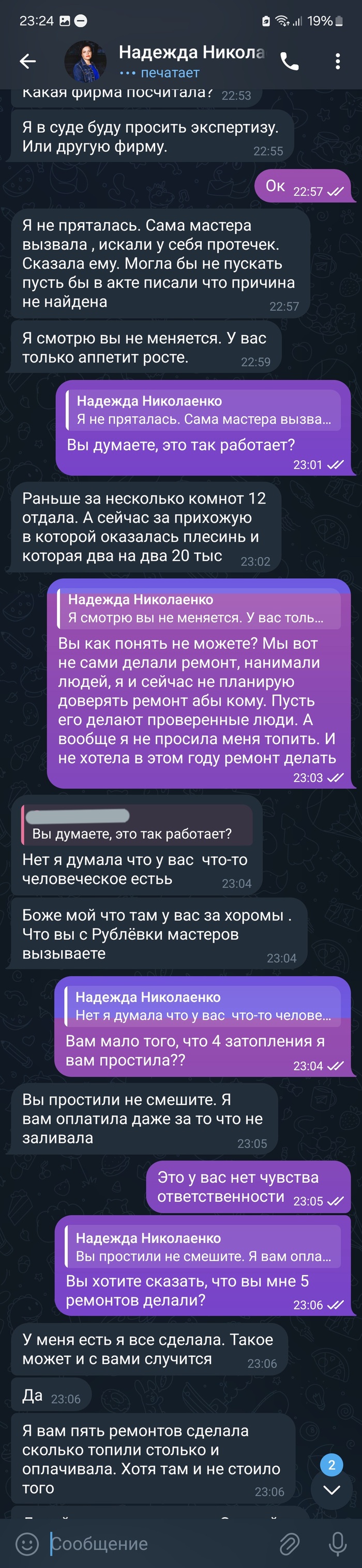 Потом мы сделали ремонт, она затопила нас ещё 2 раза, оба раза я уже обращалась в суд, чтобы привести её в чувство. Первый раз она надавила судье на жалость и та буквально заставила меня пойти навстречу, чтобы она сама все исправила. (У неё трое детей, муж умер на производстве, она бедная несчастная, а я хочу денег от нее). Я согласилась, этот ад мы с семьёй еле пережили, клеила обои она дерьмово, недели три ушло на кухню. А потом она поехала с детьми на море. Фото выложила в вк.
